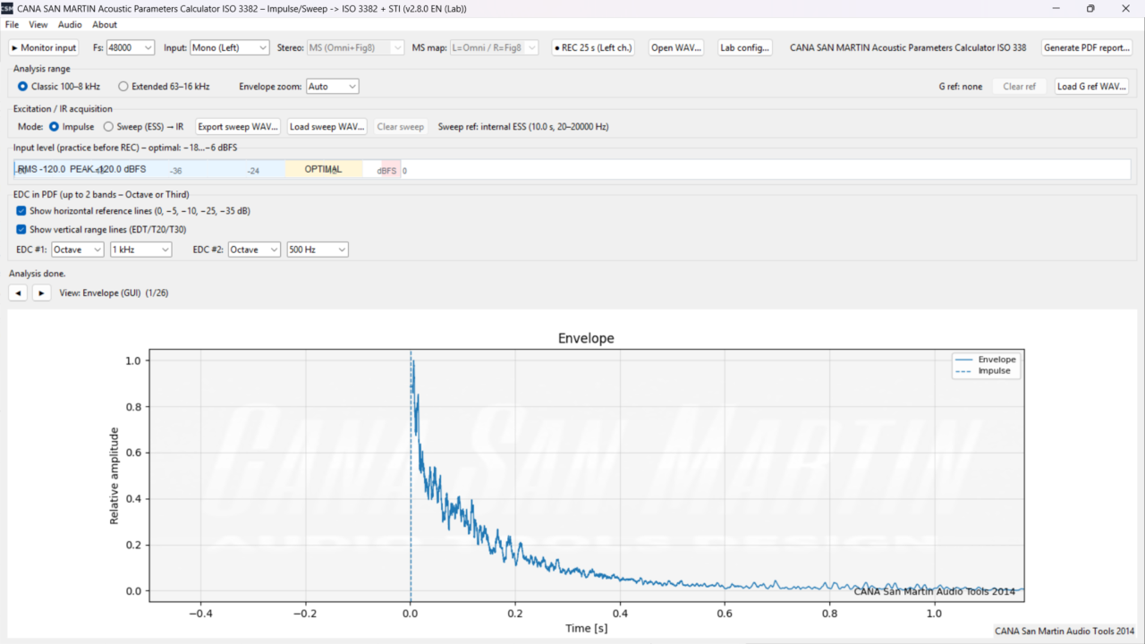 CANA SAN MARTIN Acoustic Parameters Calculator (ISO 3382 • STI) es una herramienta de escritorio pensada para el análisis acústico de salas a partir de una respuesta al impulso (IR). El objetivo operativo es convertir una medición (o un archivo de audio) en resultados técnicos consistentes y entregables formales, calculando parámetros ISO 3382 y STI (según IEC 60268-16 por método indirecto desde IR), con visualización inmediata y generación automatizada de reportes.