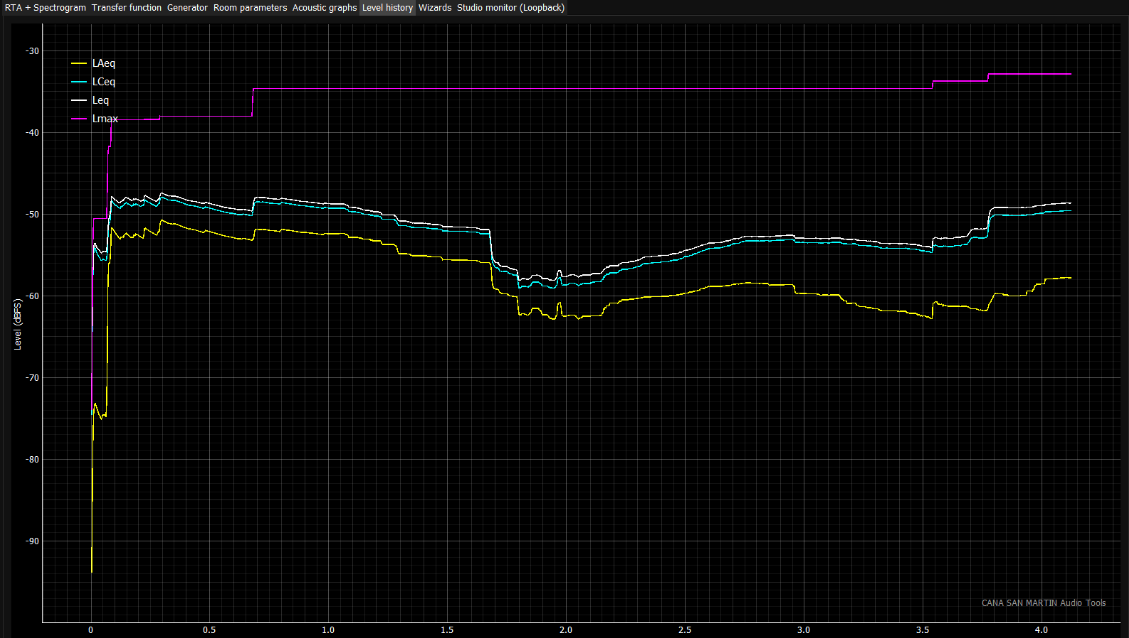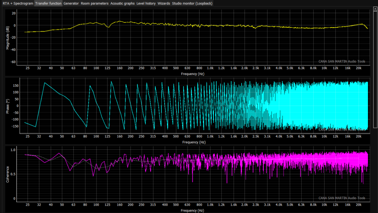 La herramienta está organizada como un conjunto de módulos que cubren estos dominios y flujos de trabajo típicos. En la interfaz se observan pestañas como RTA + Spectrogram, Transfer function, Generator, y módulos de verificación y sala (Room parameters, Acoustic graphs, Level history, Wizards), además de Studio monitor (Loopback) para monitoreo de audio de escritorio.